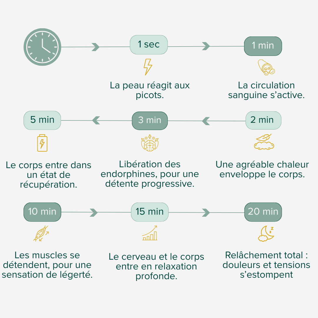 La pression des milliers de pointes libère progressivement les tensions accumulées dans les muscles, les nerfs et les ligaments, améliorant souplesse et mobilité.